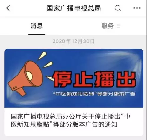 國家廣播電視總局辦公廳發佈關於停止播出「中醫新知甩脂貼」等部分版本廣告的通知。