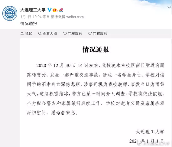 1月1日,大連理工在其官方微博發佈《情況通報》稱,「2020年12月30日14時左右,我校凌水主校區南門附近有朋路轉彎處,發生一起嚴重交通事故,造成一名學生身亡。學校對該同學的不幸身亡深感悲痛。涉事司機為我校教師,事發當日為雨雪天氣,道路積雪結冰,警方已第一時間介入調查,學校將依法依規、全力配合警方和家屬做好後續工作。學校對逝者父母及親屬表示深切慰問,願逝者安息」。