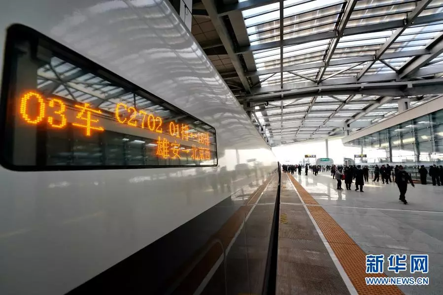 2020年12月27日,從雄安開往北京西的首發列車停靠在雄安站站台。新華社記者 牟宇 攝