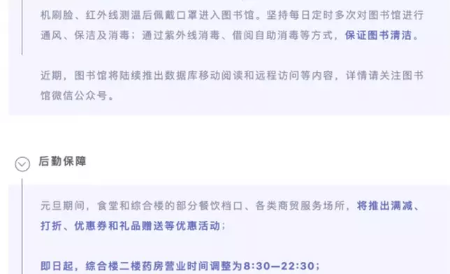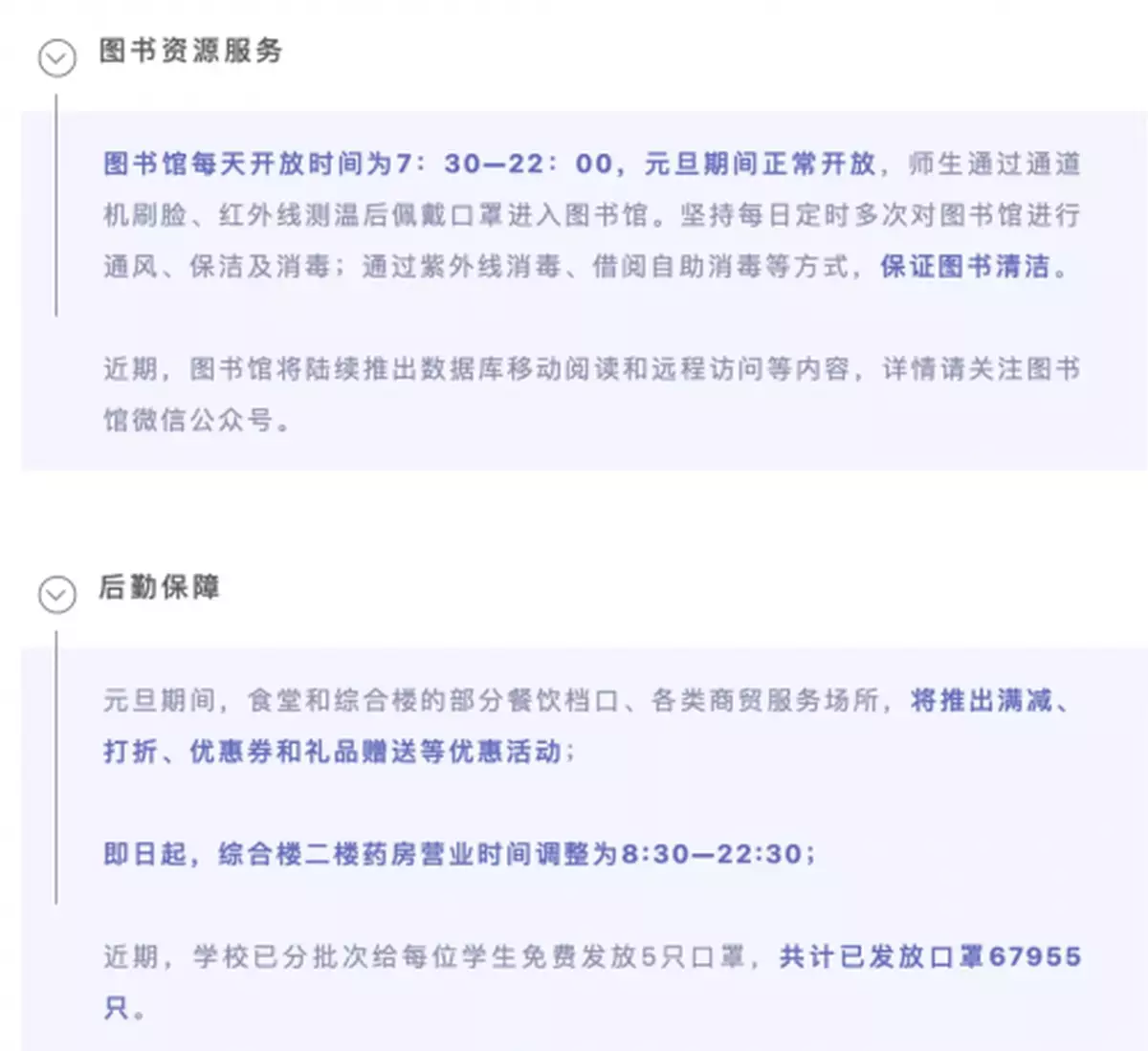 在大連海事大學,學校將承擔同學們因放假時間調整而產生的退票費、改簽費,提升校園網路質量。元旦期間,學校還為全體學生準備了總價值40萬元就餐抵值券和2萬套果盒,向大家送去新年的慰問和祝福。