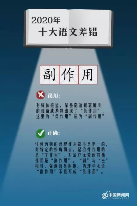 某些防治新冠肺炎的疫苗或藥物出現了「負作用」,這裏的「負作用」應為「副作用」。任何藥物的藥理作用都不是單一的,對特定的疾病而言,起治療作用的是「主作用」,對治療無效的其他作用是「副作用」。「副」與“主”相對,強調的是附帶。藥理學術語「副作用」不能寫成「負作用」。
