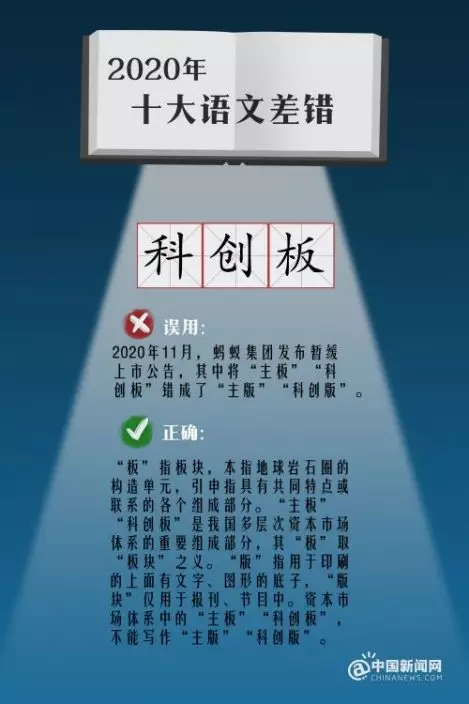 九、「科創板」誤為“科創版”。2020年11月,螞蟻集團發佈暫緩上市公告,其中將“主板”「科創板」錯成了“主版”“科創版”。“板”指板塊,本指地球岩石圈的構造單元,引申指具有共同特點或聯繫的各個組成部分。“主板”「科創板」是我國多層次資本市場體系的重要組成部分,其“板”取“板塊”之義。“版”指用於印刷的上面有文字、圖形的底子,“版塊”僅用於報刊、節目中。資本市場體系中的“主板”「科創板」,不能寫作“主版”“科創版”。
