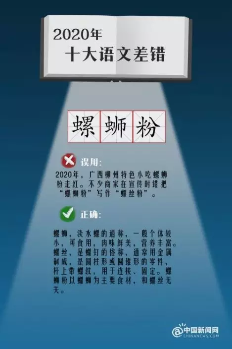 十、「螺螄粉」誤為「螺絲粉」。2020年,廣西柳州特色小吃螺螄粉走紅。不少商家在宣傳時錯把「螺螄粉」寫作「螺絲粉」。螺螄,淡水螺的通稱,一般個體較小,可食用,肉味鮮美,營養豐富。螺絲,是螺釘的俗稱,通常用金屬製成,是圓柱形或圓錐形的零件,桿上帶螺紋,用於連接、固定。螺螄粉以螺螄為主要食材,和螺絲無關。