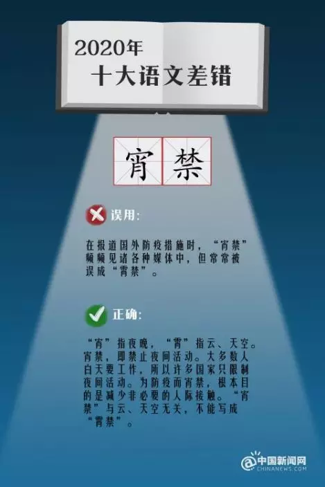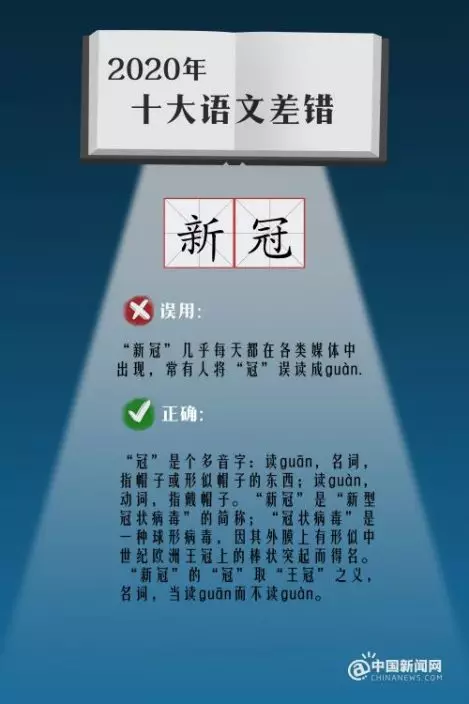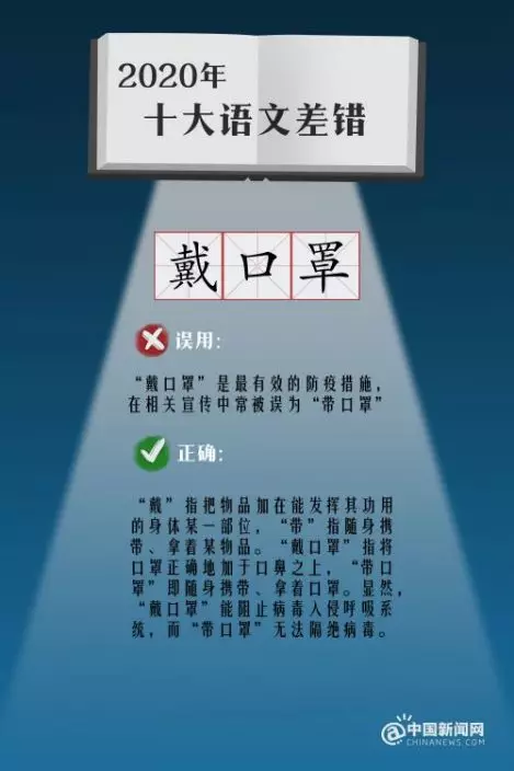 《咬文嚼字》編輯部日前公佈了2020年度「十大語文差錯」。其中,包括「新冠」的「冠」誤讀為guàn;「戴口罩」誤為「帶口罩」;「共渡難關」誤為「共度難關」;「螺螄粉」誤為「螺絲粉」等差錯上榜。
