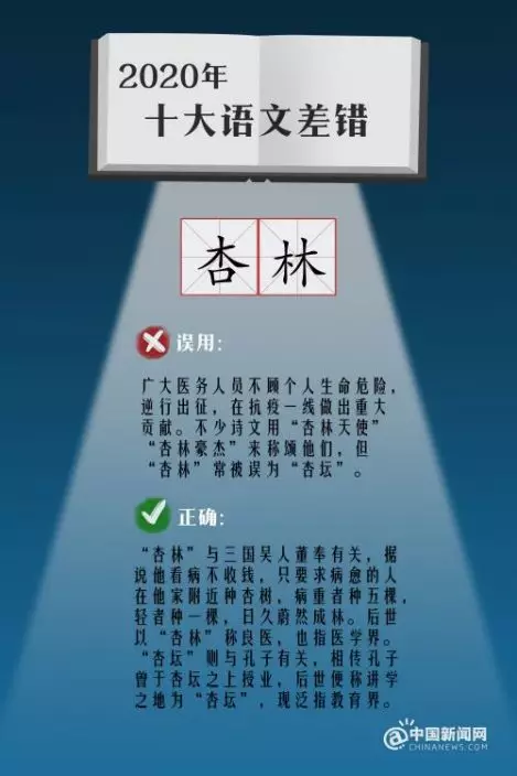 四、「杏林」誤為「杏壇」。廣大醫務人員不顧個人生命危險,逆行出征,在抗疫一線做出重大貢獻。不少詩文用「杏林天使」「杏林豪傑」來稱頌他們,但「杏林」常被誤為「杏壇」。「杏林」與三國吳人董奉有關,據說他看病不收錢,只要求病癒的人在他家附近種杏樹,病重者種五棵,輕者種一棵,日久蔚然成林。後世以「杏林」稱良醫,也指醫學界。「杏壇」則與孔子有關,相傳孔子曾於杏壇之上授業,後世便稱講學之地為「杏壇」,現泛指教育界。