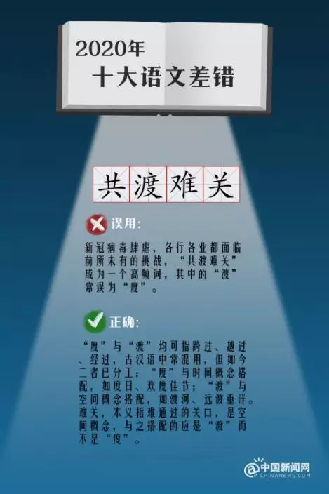 三、「共渡難關」誤為「共度難關」。新冠病毒肆虐,各行各業都面臨前所未有的挑戰,「共渡難關」成為一個高頻詞,其中的「渡」常誤為「度」。「度」與「渡」均可指跨過、越過、經過,古漢語中常混用,但如今二者已分工:「度」與時間概念搭配,如度日、歡度佳節;「渡」與空間概念搭配,如渡河、遠渡重洋。難關,本義指難通過的關口,是空間概念,與之搭配的應是「渡」而不是「度」。