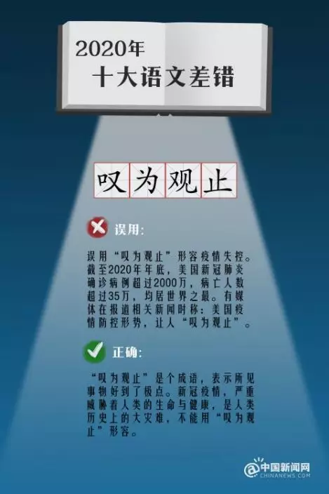 相關新聞時稱:美國疫情防控形勢,讓人「嘆為觀止」。「嘆為觀止」是個成語,表示所見事物好到了極點。新冠疫情,嚴重威脅著人類的生命與健康,是人類歷史上的大災難,不能用「嘆為觀止」形容。