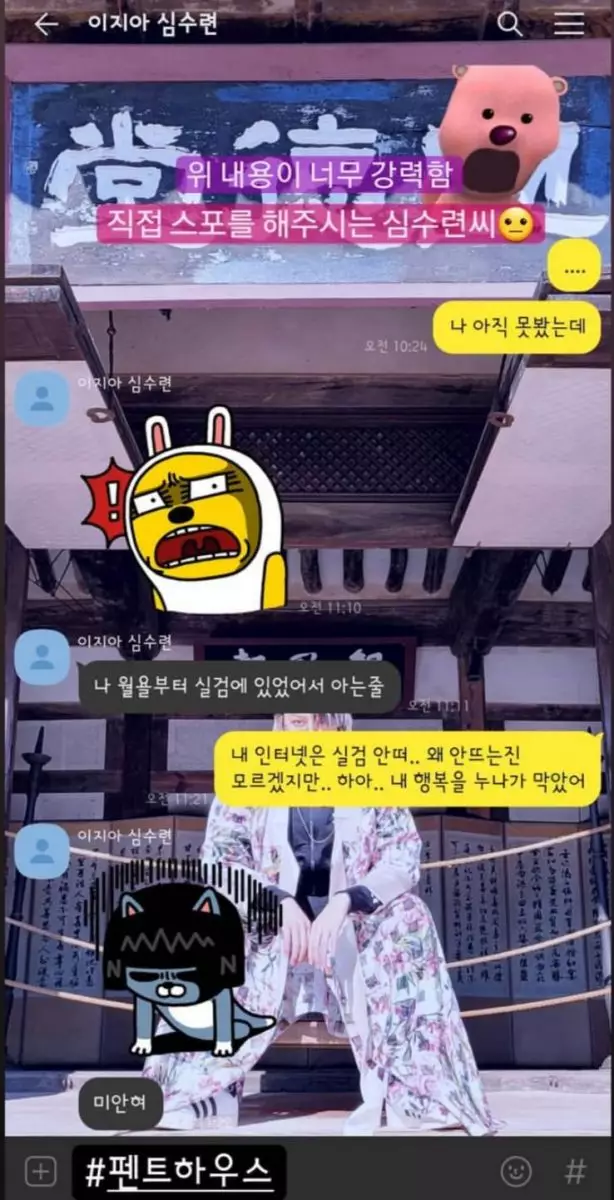在聊天對話中,還可看到希澈把對方的名字儲存為「李智雅 沈秀蓮」,也就是《The Penthouse》中的角色名字。李智雅近期為了宣傳劇集而登上了白種元老師的美食綜藝節目《美味的廣場》做嘉賓,有份做固定主持的金希澈在碰見李智雅的剎那也興奮地直接用「沈秀蓮」來稱呼對方,在一起坐車移動時也是在討論著劇情,當時在節目他就向其他人介紹說:「姐姐在劇中孩子們叫朱碩勳和朱碩京,是對雙胞胎,他們太壞了!我看的時候真的邊看邊罵,姐姐為什麼那樣教育子女呢?」、又說:「姐姐你要小心體育老師具虎東啊...他盯上了你!」看來的確是位非常投入的《The Penthouse》的忠實劇迷。