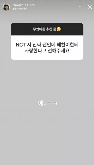 5日晚上太妍在自己IG上傳了一則限時動態寫道:「無論是什麼都推薦一下吧!」,引來了大批粉絲的留言。粉絲都很踴躍地推薦不同的電影、電視劇和好吃的零食給她,當中就有一名粉絲向太妍表示:「我真的是NCT的粉絲,請幫我告訴楷燦我很喜歡他!」太妍看到後就帥氣地回覆:「好啊…」,展現了她有求必應的性格。