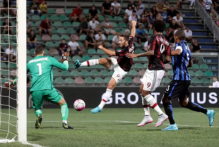 哥倫比亞籍前鋒卡路士巴卡以一已己之力殺入禁區,為AC米蘭拉開紀錄到2:0。(AP圖片)