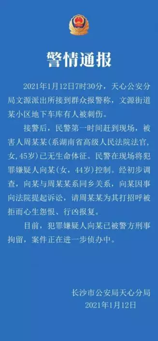 接警後,民警第一時間趕到現場,被害人周某某(系湖南省高級人民法院法官,女,45歲)已無生命體征。民警在現場將犯罪嫌疑人向某(女,44歲)控制。經初步調查,向某與周某某系同鄉關係,向某因事向法院提起訴訟,請周某某為其打招呼被拒而心生怨恨、行凶報復。目前,犯罪嫌疑人向某已被警方刑事拘留,案件正在進一步偵辦中。