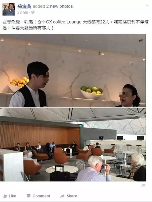 蘇施黃再開火!她在Facebook上大鬧國泰航空貴賓室Coffee Lounge,指兩名職員開工時不停聊天,嘈到客人,更上載兩名職員正面照,引來網民討論。