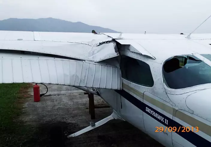 事發在2013年9月28日上午10點,一架登記編號B-HRH的塞斯納(Cessna)C172P型定翼機,返回石崗機場着陸,着地後彈起,機師因此啟動中斷着陸程序以進行復飛,但不成功,機身翻轉並停於跑道北面的草坪上。機上兩名乘客受輕傷。