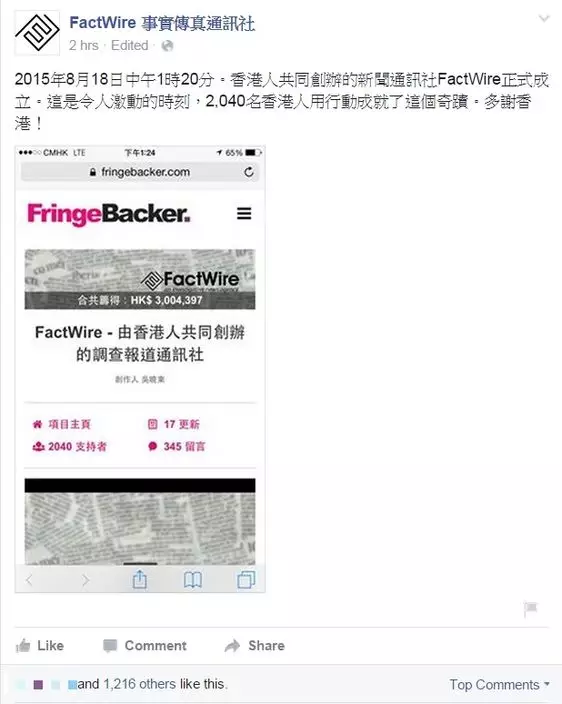 資深記者吳曉東透過籌款網站向公眾成功籌得300萬元,「FactWire事實傳真通訊社」於今午正式成立,成為全港首間獨立的新聞通訊社。