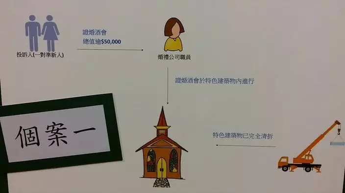 在首宗個案,新人購買價值5萬元的證婚酒會服務,付了3萬元訂金。銷售員在推銷產品時,介紹一個疑似玻璃教堂作為證婚場地,但其後發現該建築物因僭建而需要清拆,售出服務前已接獲屋宇署的清拆令。新人上門與婚禮公司交涉不成功,向海關投訴。
