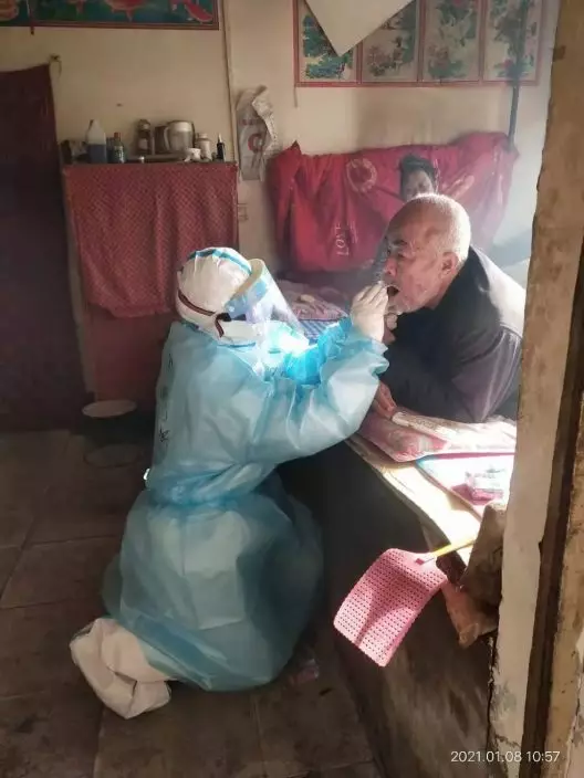 藁城區是高風險地區,對於重點人群和區域要進行多次核酸檢測。郭嬌嬌說,她平均每天要給三四百人做核酸採集工作,印象最深的是一位老人。入戶到老人家裏,當時老人躺在床上,為了更清楚地看到採集部位,保證標本採集質量,郭嬌嬌跪在地上,用手托住老人的下頜。