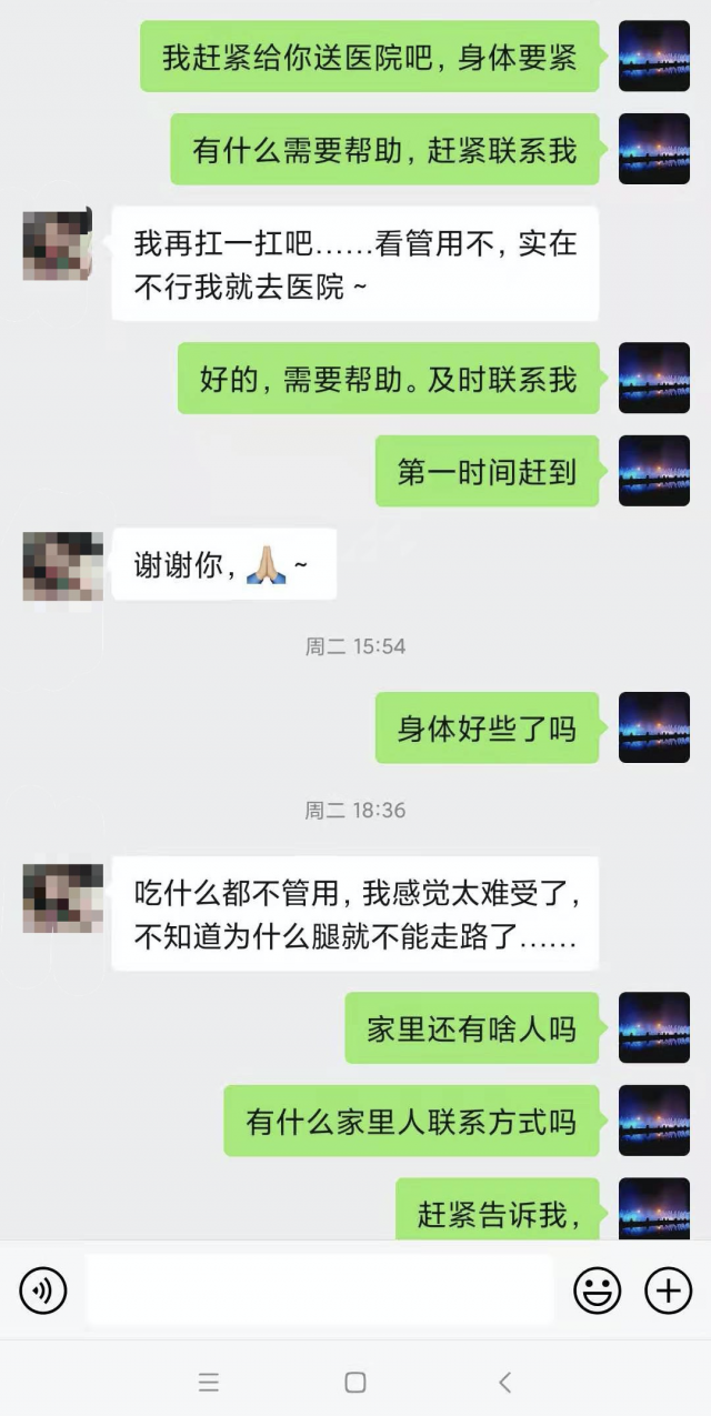 △汪勇與顧客短訊對話截圖當時,女子回復說想再等等看如果有需要再聯繫他再次主動聯繫發現女子病情加重當天下午3點54分由於不放心這位顧客的病情汪勇再次主動詢問這次,女子一直等到下午6點半才回復說自己吃什麼都不管用「我感覺太難受了不知為什麼腿不能走路了」