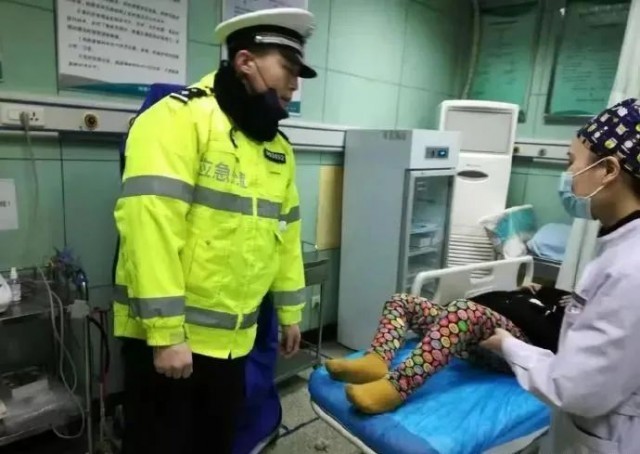 △女子被送醫 圖片來源/西安交警蓮湖大隊汪勇則留在現場安慰照顧兩個孩子直到晚上7點半社區工作人員到來後他才離開目前,女子已脫離生命危險正在進一步治療中