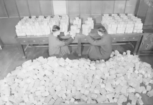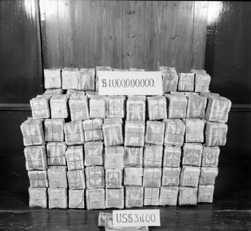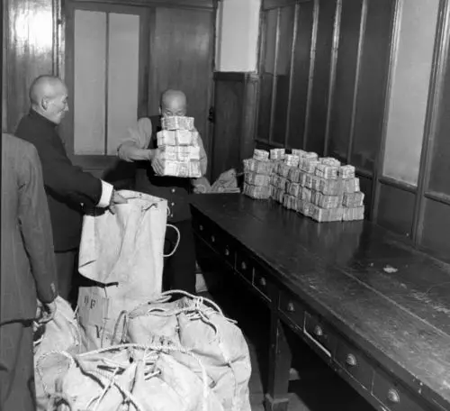 解放戰爭中國民黨軍費開支浩繁赤字劇增,法幣發行垂直上升,貶值幅度蔚為壯觀。這是1948年3月的發薪奇景。圖為堆積如山的法幣,10億法幣與3400美元價值相當。