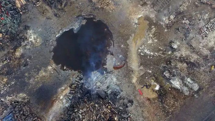 內地傳媒報道指,目前發現爆炸現場最少仍有4個著火點,其中一處位於核心區旁邊的汽車物流園,疑為汽車油箱燃燒,其餘三處位於核心區內。有10餘輛挖掘機在清理現場,另有大型卡車不停地將清理出的汽車等爆炸殘骸拉出現場。