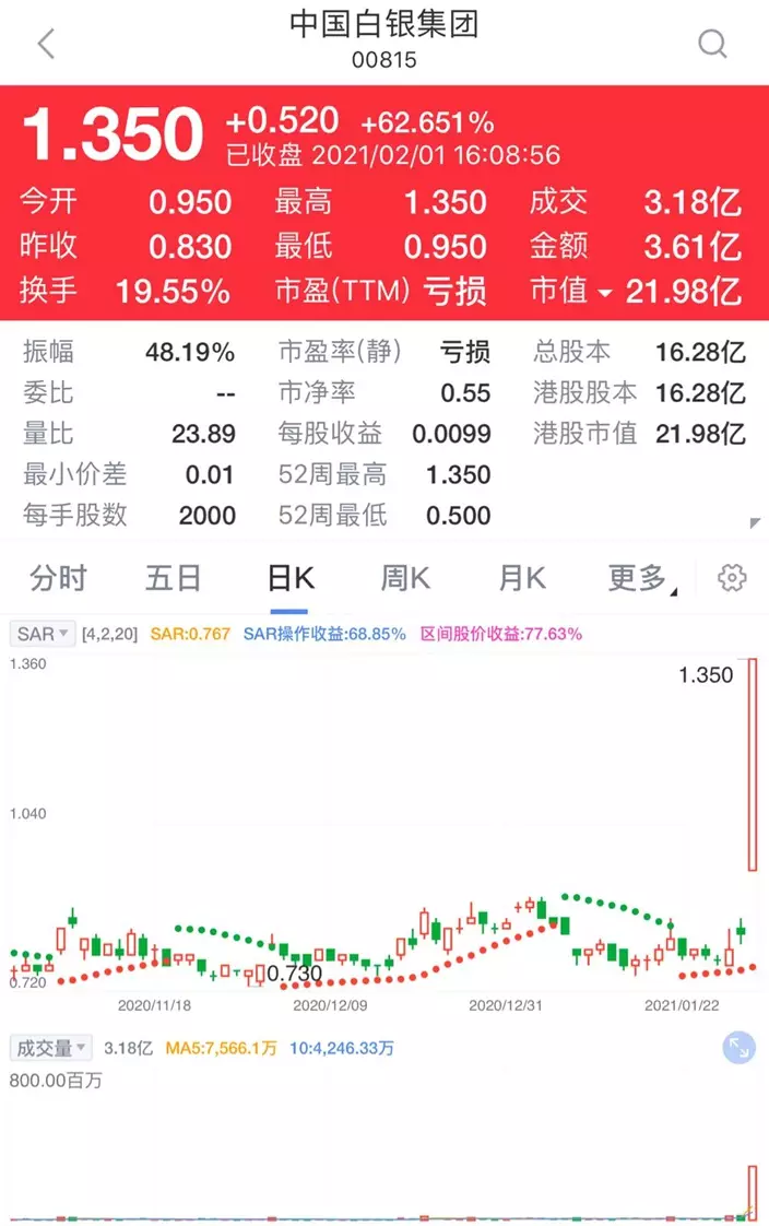 今日卻益了港股,中國白銀(815),急漲創逾5個半月高位,大升62%至1.35元