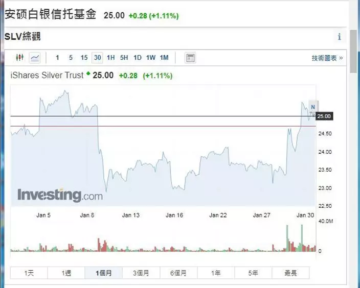 今天歐洲時段,白銀ETF(SLV),反應平靜,比上周四只升了6至8%左右,今次WSB炒高白銀神話料難再現