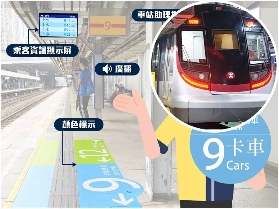 港鐵還提醒乘客要留意候車新安排,因新的9卡列車會與現有12卡列車一同「混跑」一段時間,上落車的位置有不同,港鐵請乘客留意廣播、乘客資訊顯示屏、月台顏色標示(藍色代表9卡車;綠色代表12卡車),和車站助理的指示。