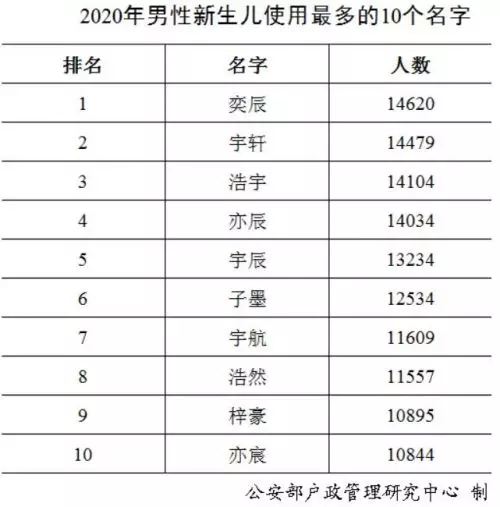 截止到2020年12月31日,2020年出生並已經到公安機關進行戶籍登記的新生兒共1003.5萬,其中男孩529.0萬,佔52.7%,女孩474.5萬,佔47.3%。2020年「百家姓」中新生兒登記姓氏最多的是「李」,共72.6萬人。
