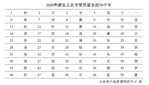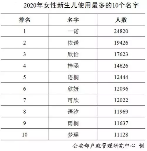 2020年出生並已經進行戶籍登記的女性新生兒中,使用頻率最高的10個名字依次為:「一諾」「依諾」「欣怡」「梓涵」「語桐」「欣妍」「可欣」「語汐」「雨桐」「夢瑤」。