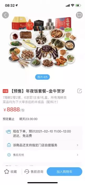 記者搜索發現,叮咚買菜平台推出了火鍋套餐,每日優鮮推出了椰子雞、水煮魚等地方特色快手菜。盒馬除了半成品菜品之外還推出了年夜飯套餐,其中包含了需簡單加工的龍蝦以及熱炒出鍋的菜品,並提到「保溫配送、儘快30分鐘送達。」該套餐分為三個檔次,包含海鮮、葷素菜、主食及禮盒,由於菜品數量不同,分別定價1888元、3888元、8888元。