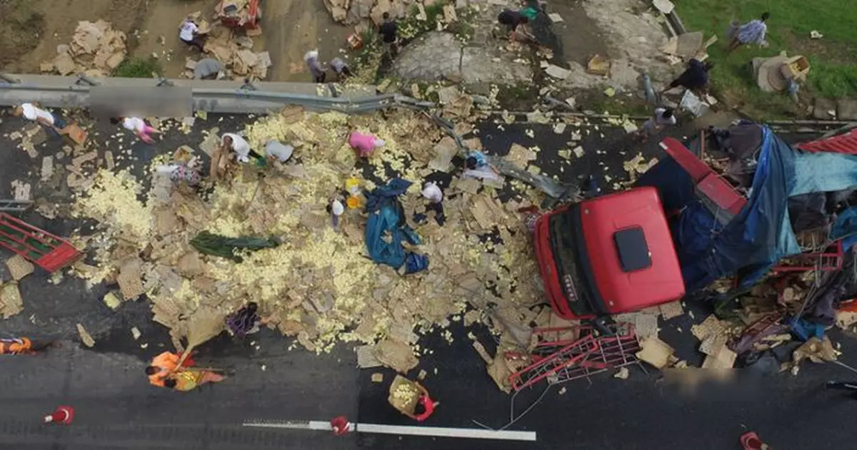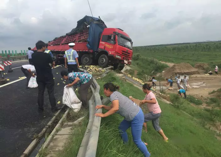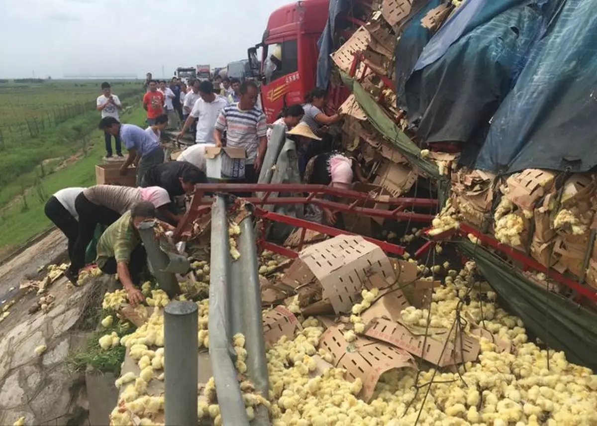 中國人「地上執到寶,問天問地攞唔到」的陋習幾時肯改?繼河南有貨車翻側,村民喪搶蘋果後,山東周二亦有貨車翻側,住在附近的民眾同樣瘋狂搶走車上跌出的大批小雞,再多一名車主血本無歸。