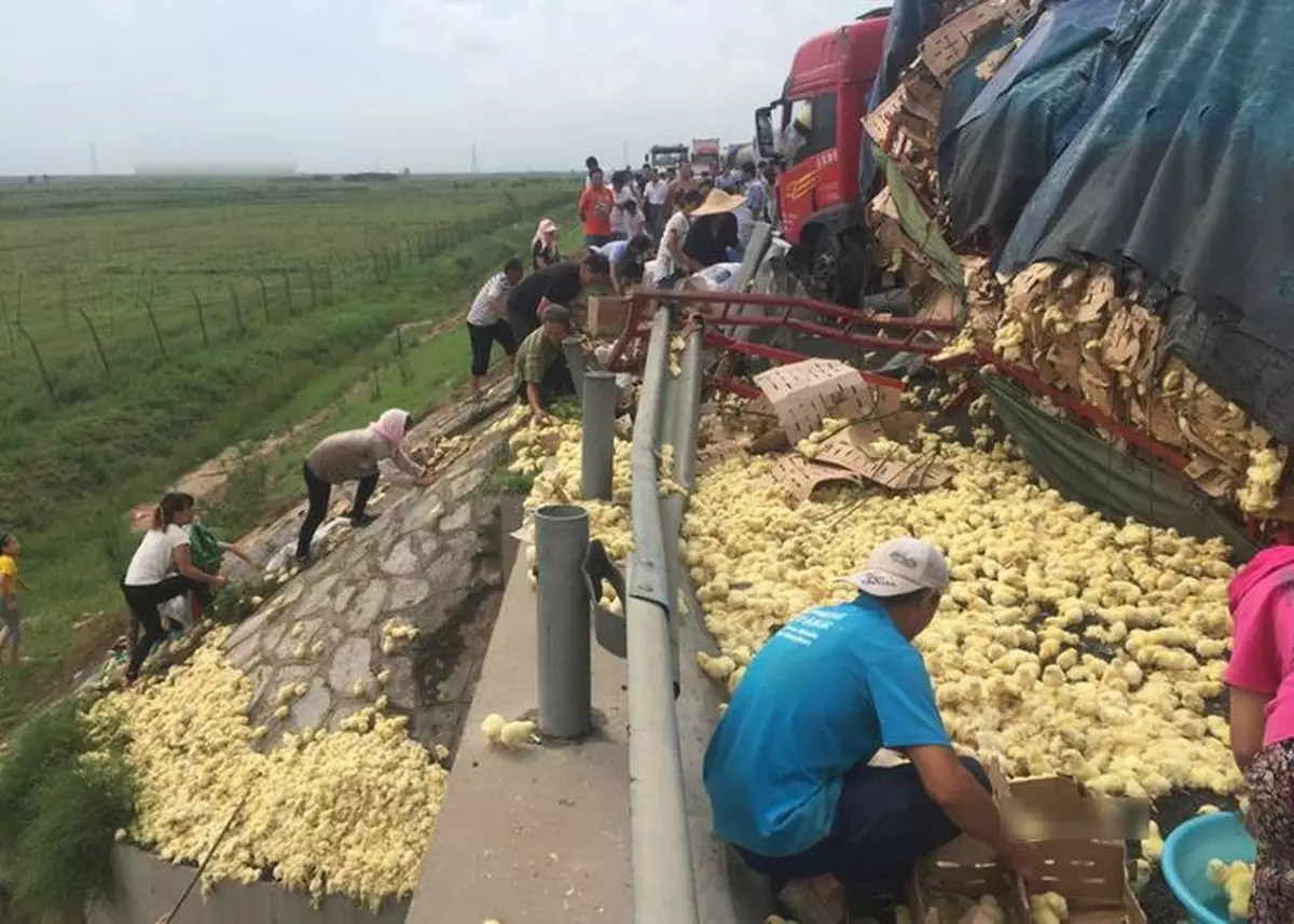 事發在山東榮烏高速濱州沾化區段,一部運送雞苗的貨車失事翻側,數萬隻小雞散落路上和高速護坡上。附近村民聞訊紛紛來捉雞,不少人開著三輪車,載滿一車回家。也有塞車的司機「咪走雞」,下車加入搶雞行列,到場的公安亦無法制止。
