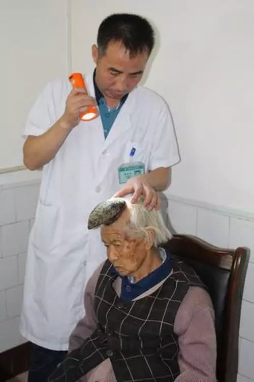 據婆婆的兒子王朝俊表示,七八年前,婆婆的頭上只是長了一顆「黑痣」,「當時我母親一直喊發癢,我們就用了些土辦法給她止癢,情況就好了一些,也就沒再管了。」但在兩年前,黑痣破了,在黑痣的地方長出了小手指大小的「小角」,王朝俊曾帶母親去看過醫生,但沒有甚麼結果。他指,由於「角」沒有繼續長大,家人也就沒有再理會。