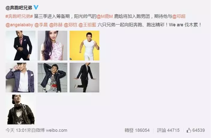 內地綜藝節目《奔跑吧兄弟》決定開拍第三季,更公開了參演藝人的名單,前EXO成員鹿晗正式加盟。