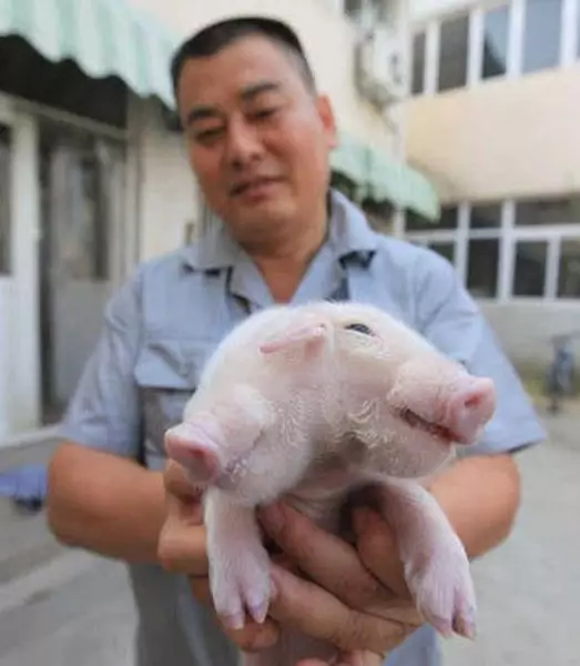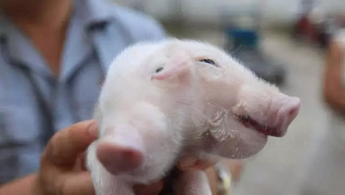 一名村民於辛口鎮玉佛寺附近發現這隻奇怪的小豬,豬BB有兩個頭、三隻耳朵,眼咪咪十分可愛,似乎剛出世不久。