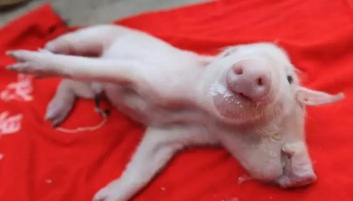 好心村民懷疑牠被遺棄,便用嬰兒奶粉餵食,驚訝發現豬BB的兩個口都能進食,不過由於頭部太重,無法站立。