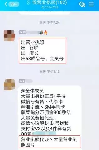 在一個「做營業執照」的QQ群,不時有群成員發佈“出營業執照”“出售招聘號”的廣告。