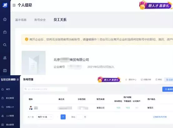 也有賣家表示,有平台沒那麼嚴,好登錄,例如智聯招聘。記者登錄賣家提供的智聯招聘賬號發現,該賬號企業認證為北京某商貿有限公司,具有發佈職位許可權,每天可發佈職位10次。國家企業信用信息公示系統顯示,該公司成立時間為2020年9月3日。記者用此賬號發佈了一條職位信息,並收到「簡歷投遞」。
