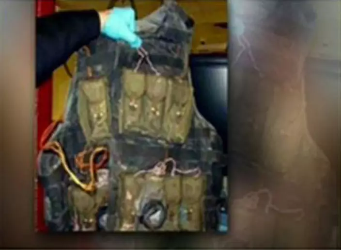 其中一張短暫展示的照片,顯示一隻戴藍色手術用手套的手,拿著一件有許多漲鼓鼓口袋的背心,口袋以電線接駁在一起,但溫泰沒有提及這些照片。
