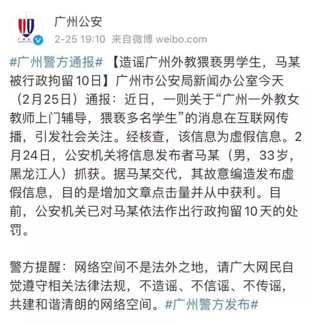 廣州公安周四(25日)通報稱,近日,一則關於「廣州一外教女教師上門輔導,猥褻多名學生」的消息在互聯網傳播,引發社會關注。經核查,該信息為虛假信息。2月24日,公安機關已將信息發布者馬某(男,33歲,黑龍江人)拘捕。據馬某交代,其故意編造發佈虛假信息,目的是增加文章點擊量並從中獲利。