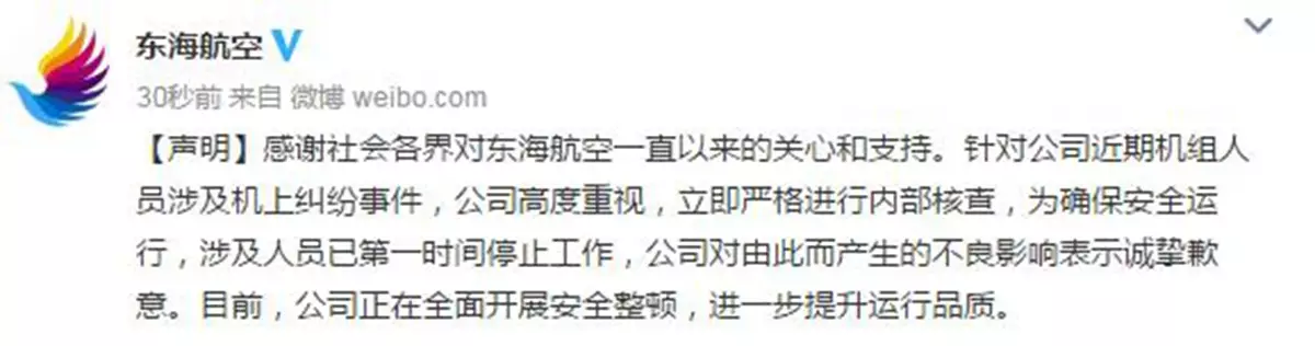 昨日(6日),網上流傳東海航空航班上機長與空中服務員,在飛行途中發生相毆的消息,今日下午,東海航空在官方微博作出回應,指公司對事件高度重視,涉事人員已第一時間停止工作,公司對由此產生的不良影響表示誠摯歉意。