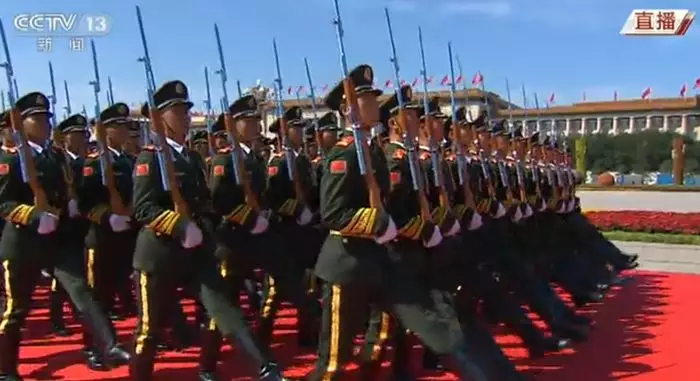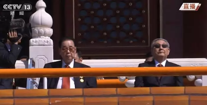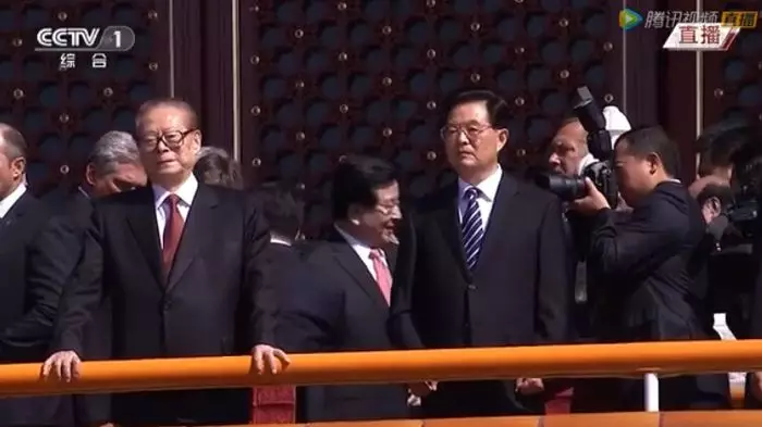 中央電視台播出的畫面,見到江澤民和胡錦濤在城樓上觀看閱兵,多名前國家領導人包括前總理李鵬、朱鎔基、溫家寶亦有到場。