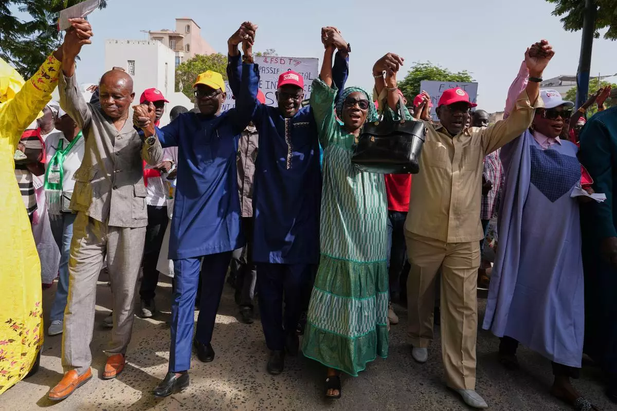 工人手牽手遊行,要求政府兌現承諾並解決民眾關注的問題。攝於2026年4月8日周三,塞內加爾達喀爾。(美聯社圖片/Misper Apawu) AP圖片