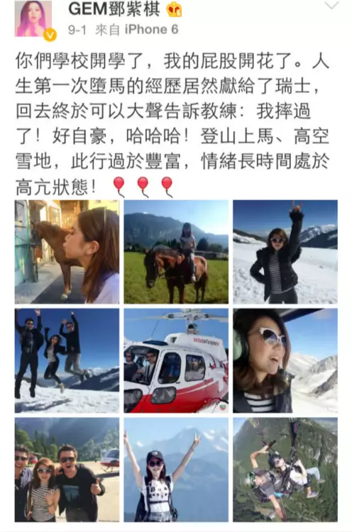 翌日另一貼文指她屁股開花了,人生第1次墮馬,居然獻給了瑞士,此行過於豐富,情緒長時間處於高亢狀態!