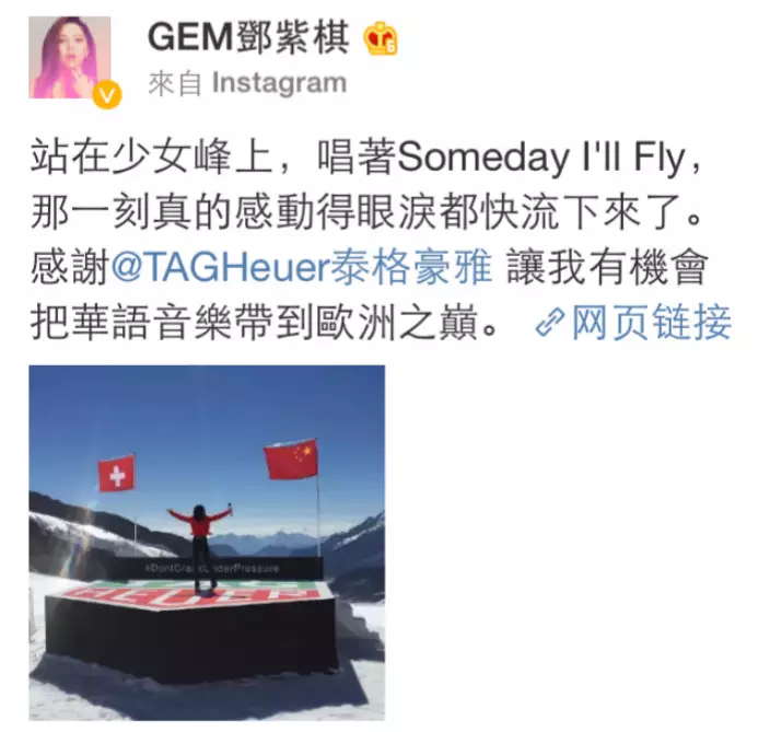 G.E.M.(鄧紫棋)日前在微博貼文貼圖,指在瑞士著名少女峰唱著《Someday I'll fly》,那一刻感動得眼淚都快流下來。她感謝名錶讓她把華語音樂帶到歐洲之巔。