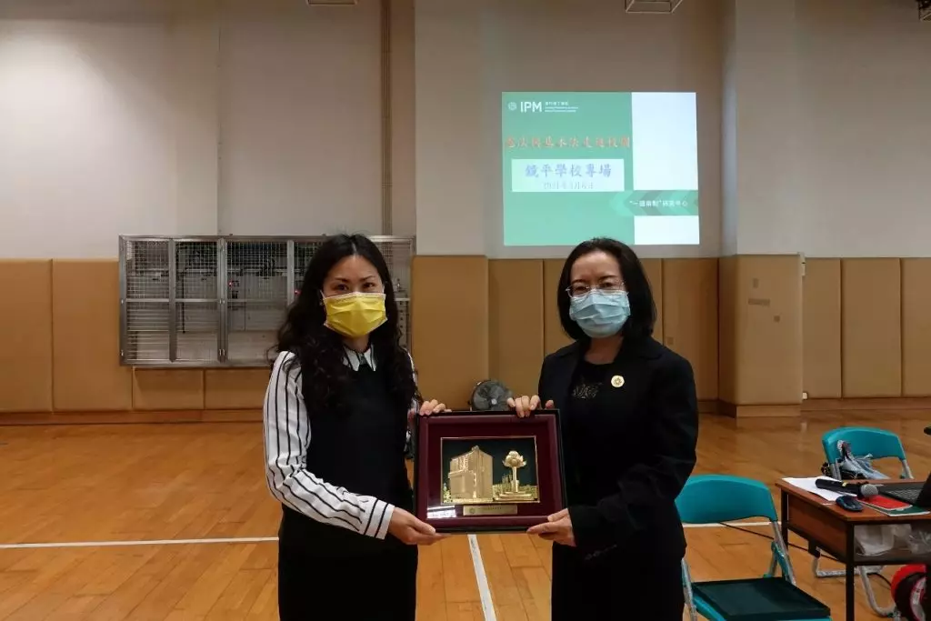 澳門理工學院“一國兩制”研究中心主任李莉娜(右)向鏡平學校主任梁靜霞(左)致送紀念品