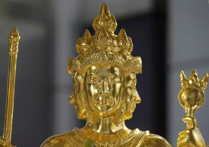 泰國曼谷四面佛附近上月發生炸彈襲擊,受損的佛像下顎完成維修,早上開光,儀式有多名市政府官員出席。