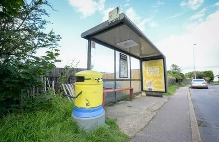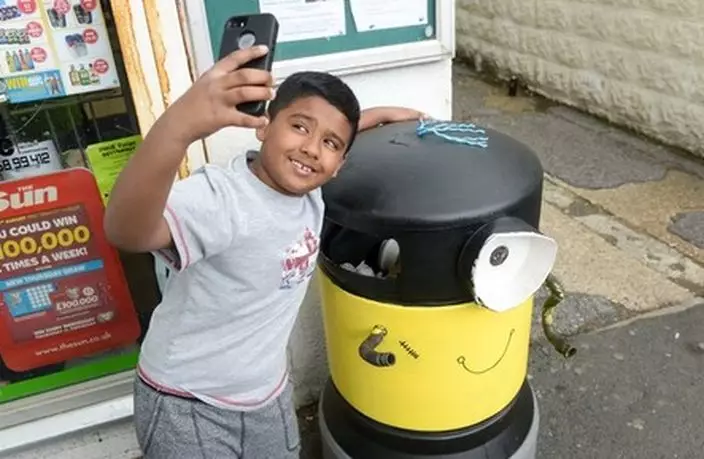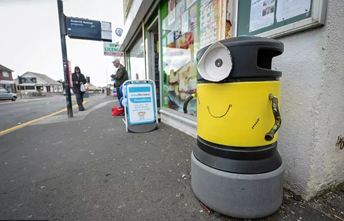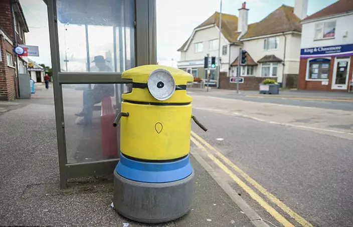 垃圾桶擁有鮮明的迷你兵團黃色臉孔及藍色粗布工人褲,在鎮上從商店門外以至公園長椅及巴士站旁隨處可見。