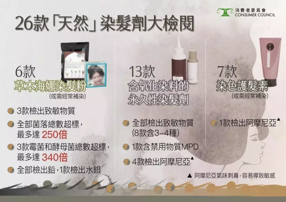 市面上出現不少聲稱成分「天然」、「草本」或「有機」的染髮劑,消委會測試26款在包裝或名稱上聲稱「天然」、「植物成分」或「有機」的染髮用品,發現6成樣本含致敏物質或重金屬,俱為永久性染髮劑及草本海娜染髮粉,存在較大使用風險,消費者切勿誤以為產品成分較「天然」,便掉以輕心。