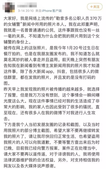 3月13日凌晨2點,網傳女輔警照片的主人公汪女士發微博:「這件事已經給我的家人和我自己造成很大困擾了」,並發佈了兩條澄清視頻,“我現在就是希望不知情的網友不要再傳播我的私人照片了,希望澄清後生活能重歸平靜。”